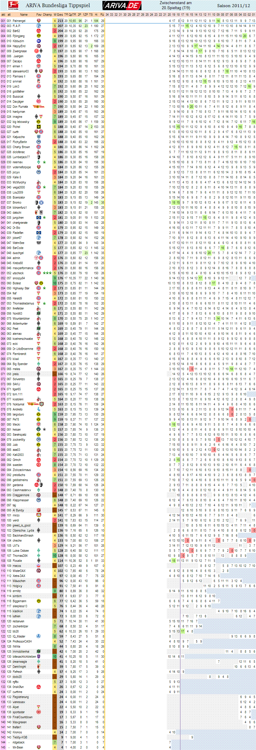 uuuund - es bleibt ja dank der Tageswertung und den Statistiken nicht verborgen - absoluter Saisonminusrekord, was die Punkteausbeute angeht!! Im Schnitt wurden gerade mal 5,30 Punkte p. Tipper eingefahren... Insgesamt 647 Punkte nur!! Und das, obwohl der Teilnahmerekórd mit 122 Tipper/innen eingestellt wurde!!