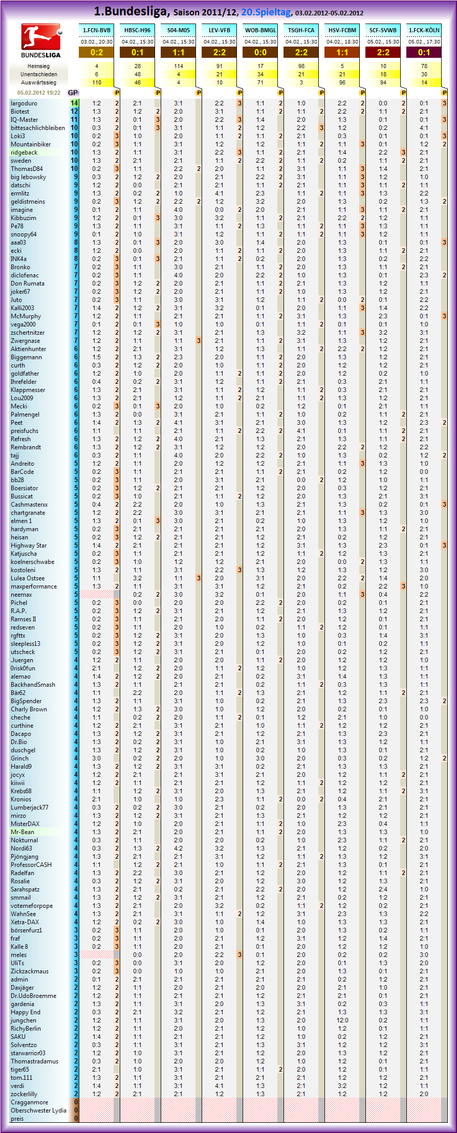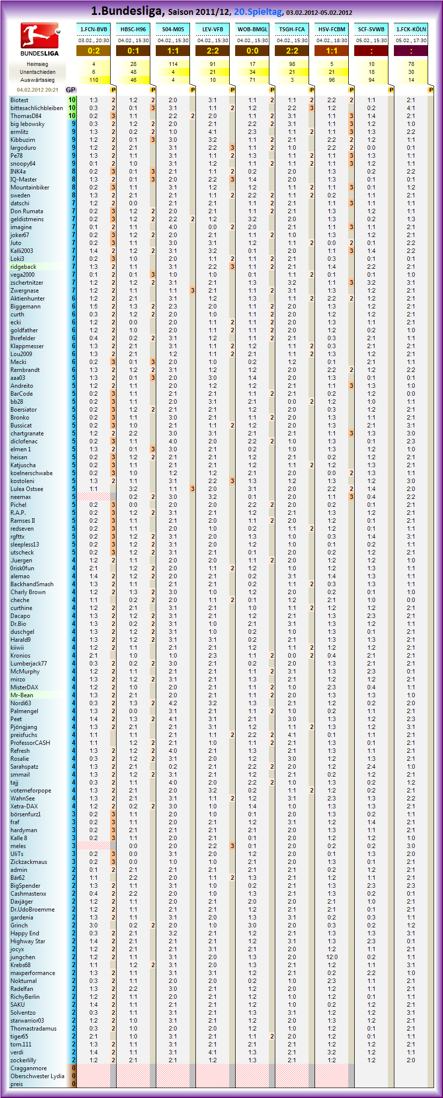 Und weiter geht´s mit dem 20.Spieltag Gespielt wird der Spieltag vom 03.02.2012 20:30 - 05.02.2012 17:30.. Die Übersicht der Partien des 20.Spieltages der 1.Bundesliga, Saison 2011/12 zum tippen: : 1.FC Nürnberg - Borussia Dortmund : Hertha BSC Berlin - Hannover 96 : FC Schalke 04 - 1.FSV Mainz 05 : Bayer 04 Leverkusen - VfB Stuttgart : VfL Wolfsburg - Borussia Mönchengladbach : TSG 1899 Hoffenheim - FC Augsburg : Hamburger SV - FC Bayern München : SC Freiburg - SV Werder Bremen : 1.FC Kaiserslautern - 1.FC Köln