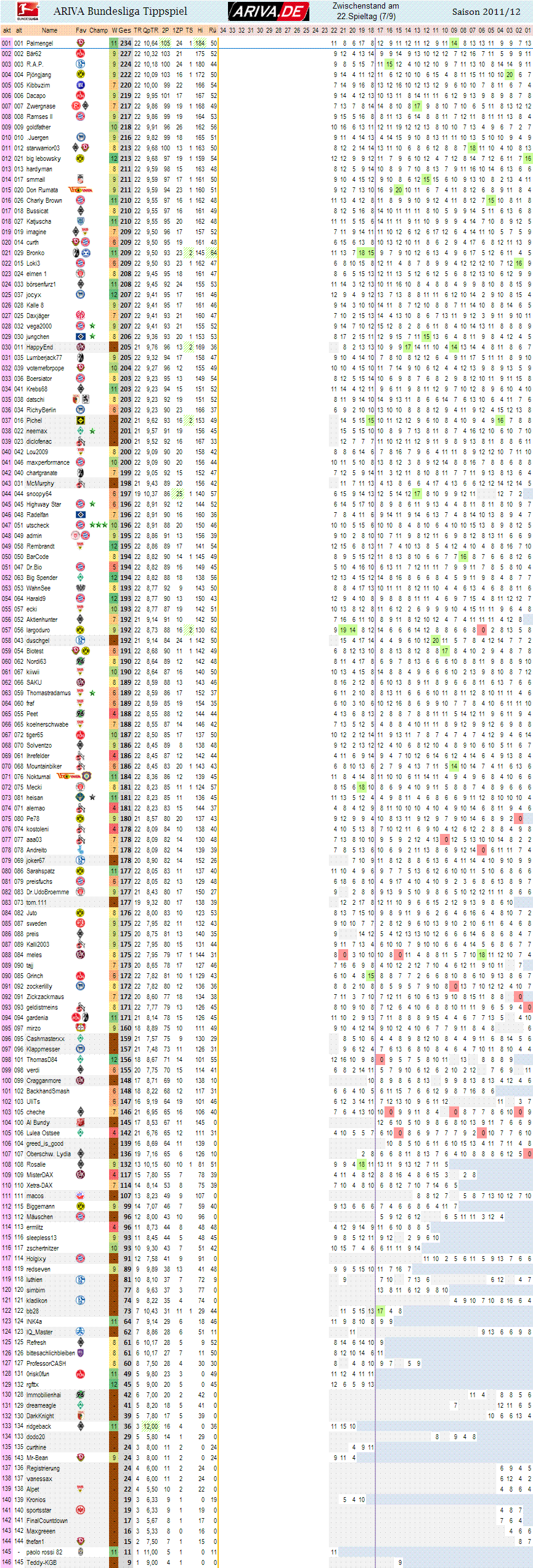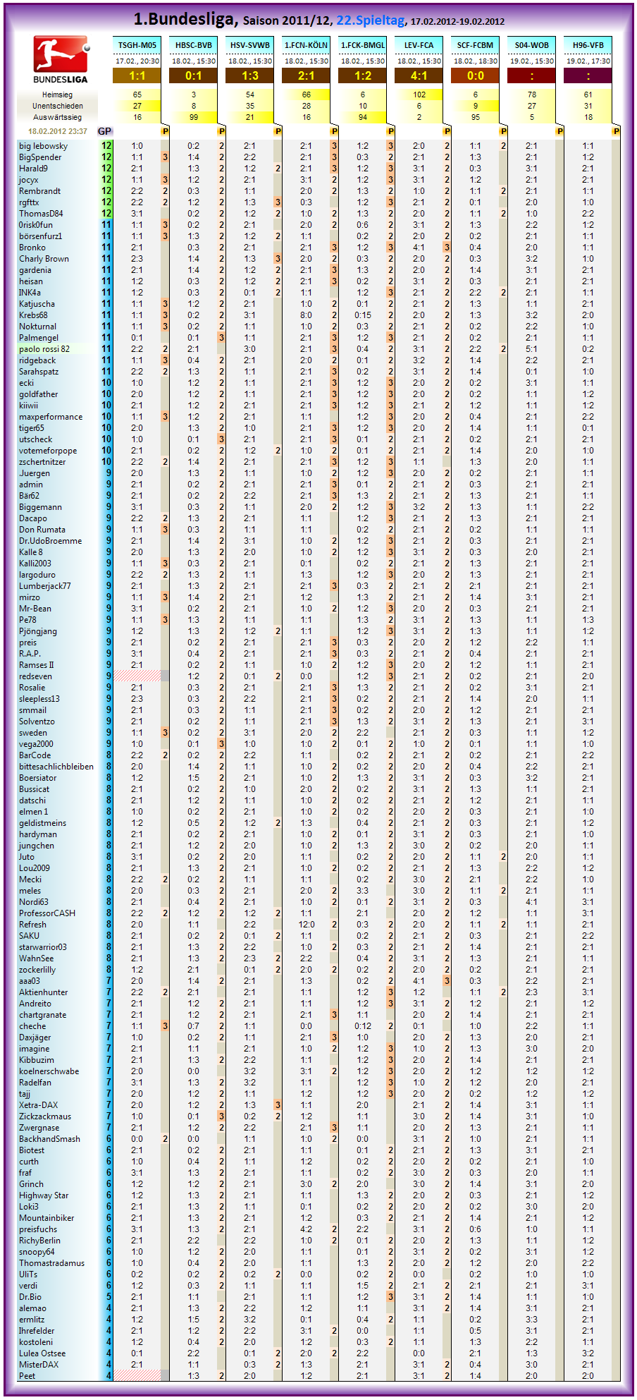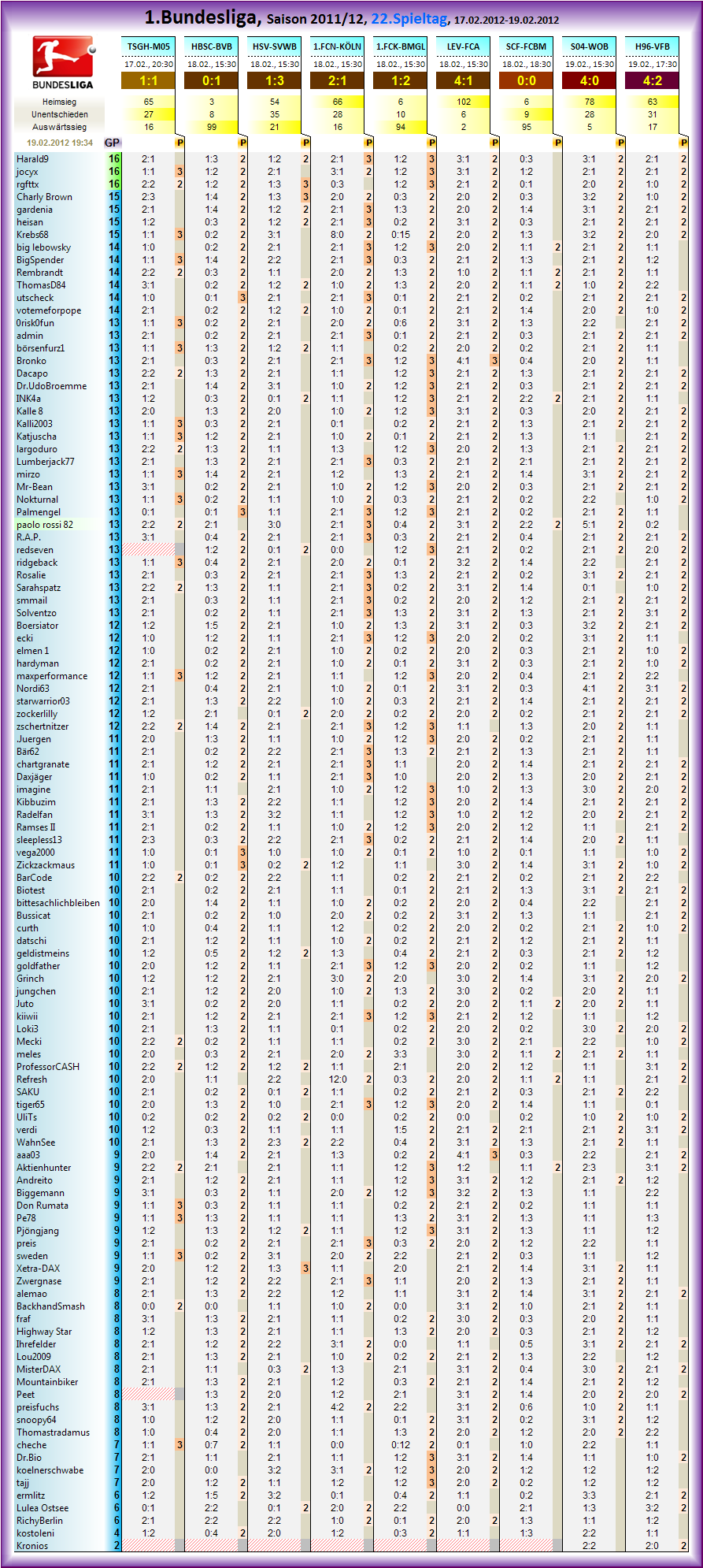 Die Übersicht der Partien des 22.Spieltages der 1.Bundesliga, Saison 2011/12 zum tippen: