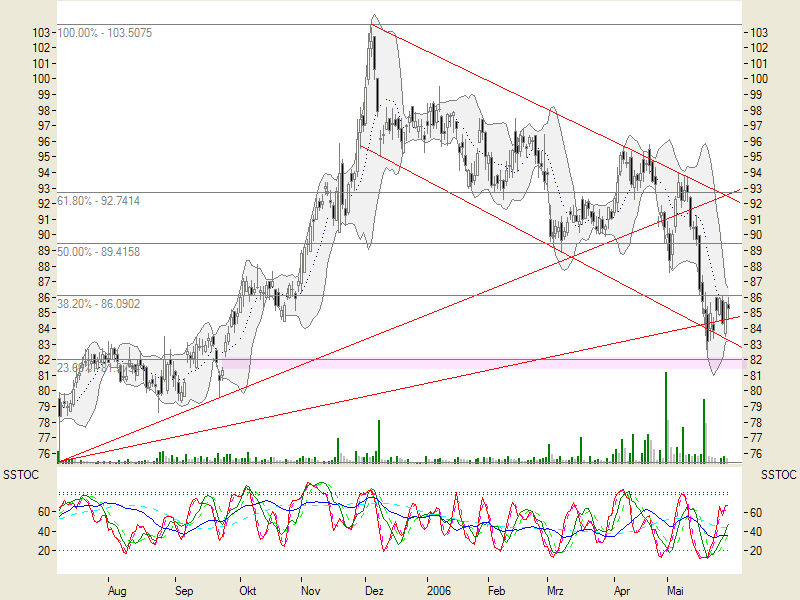 Rückblick: Die Aktie der MÜNCHENER RÜCK startete am 31.03.2003 nach einem Tief bei 50,37 Euro zu einer langfristigen Aufwärtsbewegung. Nach einem Korrekturtief im Oktober 2004 bei 72,22 Euro bildete sich ein Aufwärtstrendkanal heraus. Im Dezember 2005 kam es zu einem Zwischenhoch bei 121,88 Euro. Dieses Hoch überwand die Aktie in der letzten Septemberwoche per Wochenschlusskurs. Am 07.11.2006 kam es zum bisherigen Rallyehoch bei 131,40 Euro. Seitdem konsolidiert die Aktie, wobei sie gestern per Tagesschlusskurs knapp unter 121,88 Euro per Tagesschlusskurs zurückgefallen ist. Den langfristigen Abwärtstrend seit Januar 2001 hat die Aktie mittlerweile klar hinter sich gelassen.