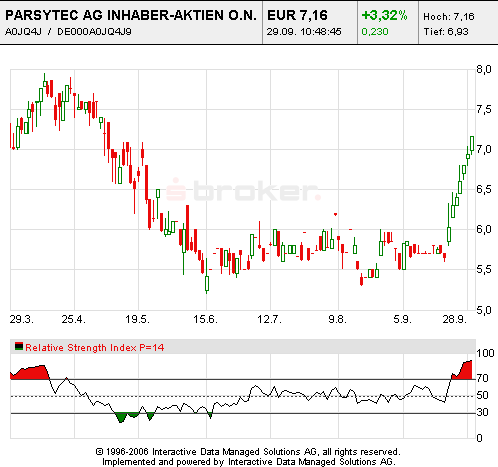 strukturelle Veränderungen hin oder her, und dass Parsytec derzeit überkauft ist, zeigt ja nicht nur der RSI, sondern auch eine Reihe anderer Indikatoren. Muss aber auch zugeben, dass ich mich mit den Fundamentals hier nur am Rande beschäftigt habe, für mich steht die Sonderausschüttung im Vordergrund. Es gab doch aber kürzlich keine Meldung, die den Kursanstieg ausgelöst hat, oder irre ich mich da? Von daher kann man ohnehin nicht sagen, worauf die Rallye nun zurückzuführen ist.