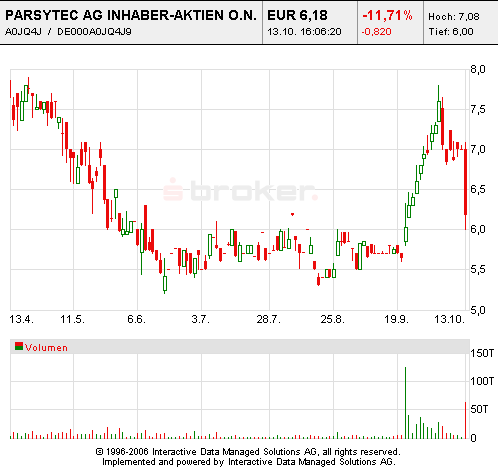 Die Aktie von Parsytec verliert derzeit 14,00 Prozent auf 6,02 Euro. (13.10.2006/ac/n/nw)