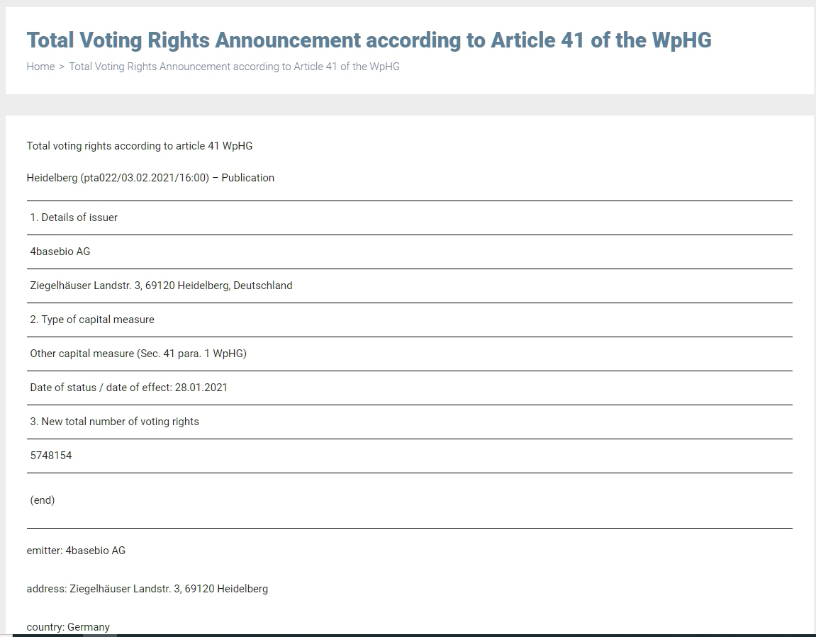 Meine Kenntnis ist, dass die AG (A2YN80) nur noch mit 5.748.154 Aktien auf dem Markt ist. Die Herabsetzung hat meiner Meinung nach am 28.1.2021 stattgefunden. Man kann dies einerseits auf der Firmenwebseite ersehen (https://4basebioag.com/shareholder-structure/) aber auch aus der Pflichtmitteilung (https://4basebioag.com/news/regulatory-news/...le-41-of-the-wphg-3/).