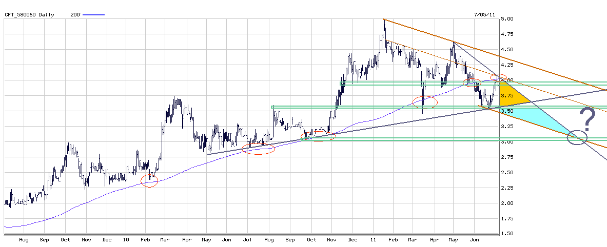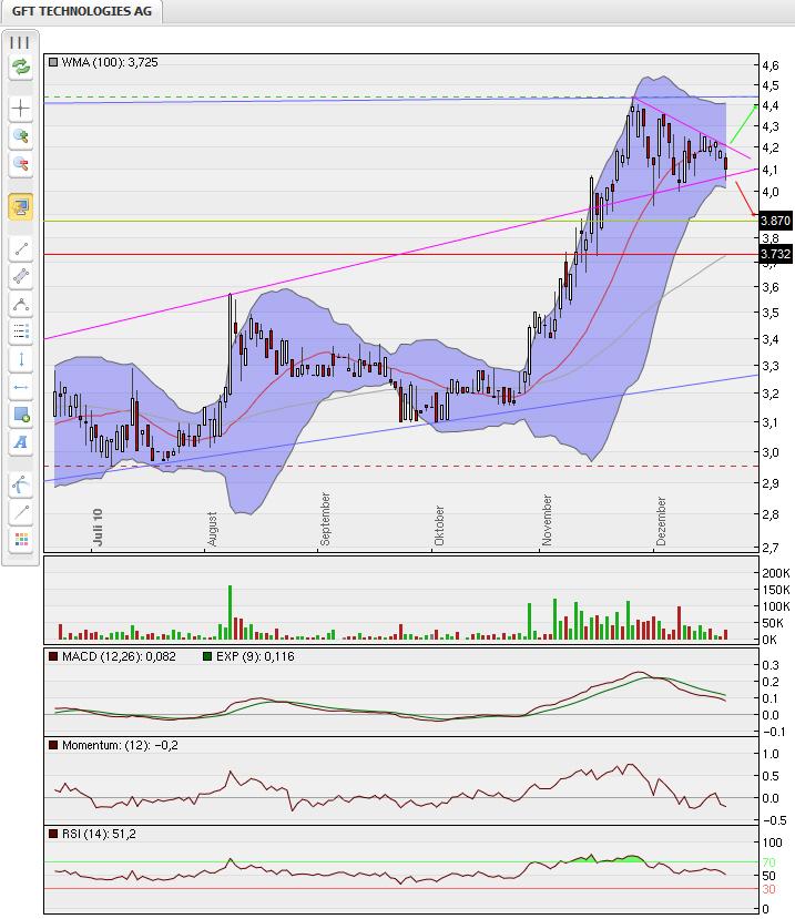 Ich denke, dass GFT durchaus in den Bereich 3,05 bis 3,30 EUR abrutschen könnte. Weiteres Ungemach schließe ich aufgrund der guten fundamentalen Aussichten aber aus. Der Beratungsbedarf der krisengeschüttelten Finanzdienstleister ist enorm. Nicht zu vergessen die möglichen Aktivitäten zur Optimierung der Stromnetze.
