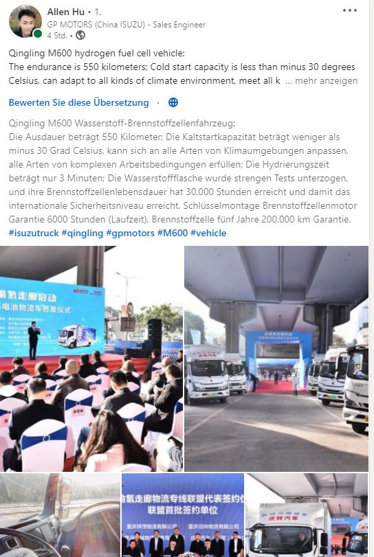 Qingling-Bosch-Wasserstoff-Lkw beendet seinen ersten Probebetrieb 13. Oktober 2021 CHINA, 13. Oktober 2021 /chinatrucks.com/ -- Am Vorabend des chinesischen Nationalfeiertags kommt die gute Nachricht vom Wasserstoff-Lkw-Markt, dass Qingling BOSCH wasserstoffbetriebene Lkw ihren ersten Probebetrieb abgeschlossen haben.  Nachdem die Qingling-BOSCH-Wasserstoff-Lkw vollständig mit Gütern beladen waren, nahmen sie am 29. September ihren Probebetrieb von Chongqing nach Chengdu auf und beendeten ihre einfache Fahrt (379,81 km) mit einer einzigen Wasserstoff-Nachfüllung von 11 kg Wasserstoffkraftstoff. Kurz nach der Ankunft in Chengdu kehrte der LKW voll beladen mit Mineralwasser in Flaschen nach Chongqing zurück. Die Ergebnisse des Probebetriebs zeigen, dass der Stapler hohe Leistung und Zuverlässigkeit bei einem sehr niedrigen Kraftstoffverbrauch bietet und gleichzeitig höchste Sicherheitsstandards erfüllt. Der Qingling-BOSCH-Wasserstoff-Lkw ist für eine Reichweite von bis zu 550 km oder mehr mit einer einzigen Befüllung ausgelegt, verbraucht in der Regel 2,6 kg Wasserstoffkraftstoff pro 100 Kilometer und ist umweltfreundlich, sicher, intelligent und zuverlässig. Dies ist Berichten zufolge das erste Mal, dass wasserstoffbetriebene Lkw einen Probebetrieb in China durchführen. Durch die Nutzung der strategischen Chance, die der Chengdu-Chongqing Hydrogen Corridor und das Dual Carbon-Ziel bietet, werden Qingling und Bosch die Entwicklung von wasserstoffbetriebenen Fahrzeugen in China aktiv vorantreiben. Quelle: www.chinatrucks.com