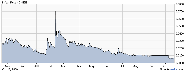 Our system posted a BUY CONFIRMED today. The previous SELL recommendation was issued on 09.29.2006 (19) days ago, when the stock price was 0.0076. Since then CKEIE has fallen -14.47% .