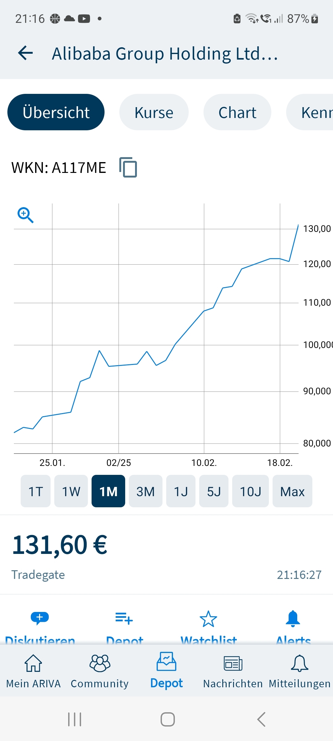 Alibaba steht gerade bei 135 EUR. Wenn wir heute Abend mit dem Kurs ins Wochenende gehen, bin ich jedenfalls super zufrieden. Ich habe immer die Überzeugung gehabt, das Kurse unter 100 EUR hier mittelfristig historisch günstige Kaufgelegenheiten sind.