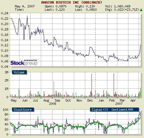 NEW YORK, NY--(MARKET WIRE)--Jun 6, 2007 -- Amazon Biotech, Inc. (OTC BB:AMZB.OB - News) (OTC BB:AMZO.OB - News) (Frankfurt:B2D.F - News) ("Company") today announced that the Company's new symbol is AMZO.Amazon Biotech recently executed a three-for-one reverse split in preparation for a pending financing for clinical trials of the company's immunomodulator drug, AMZ0026, for the treatment of HIV/AIDS. The company's all-natural whole plant pharmaceutical drug is expected to enter Phase I/II clinical trials upon closing on a financing.