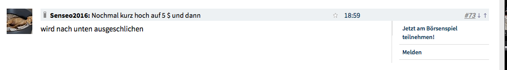 ... macht euch nix vor und schaut euch den Chart an ... geht nur abwärts. Der Laden ist fertig, wer das immer noch nicht kapiert hat dem ist nicht zu helfen. SD hin oder her ... das macht auch nix mehr. Paar % hoch und runter ... ansonsten erholt sich das wohl nicht mehr. Raus mit Verlust oder einfach warten bis die 0,01 erreicht sind ... liegt an jedem selbst. Manchmal ist die Notbremse mit Verlust besser als gar nix mehr. ... Nur meine Meinung.