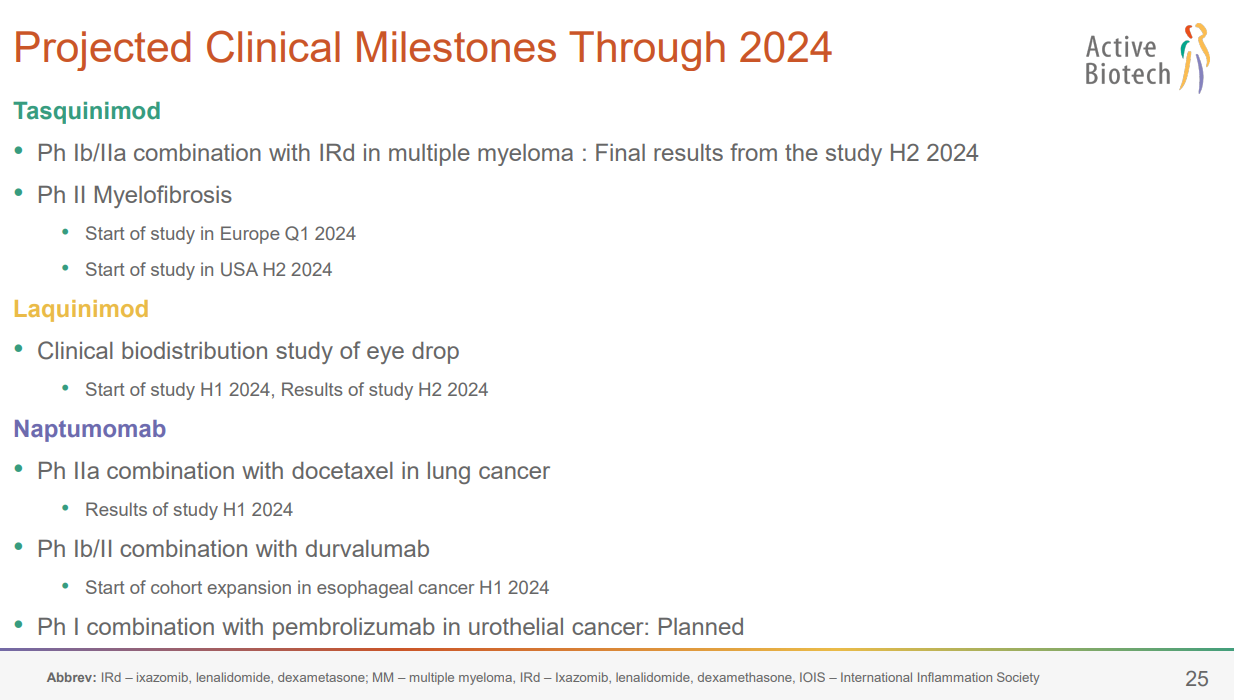 "Active Biotech: Tasquinimod clinical development in multiple myeloma advances into combination therapy following completion of the initial phase of the ongoing trial in the US