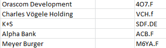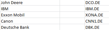wenn ihr bei yahoo finance die jeweiligen Börsenkürzel selbst raus sucht und zwar immer für die deutschen Börsenplätze.