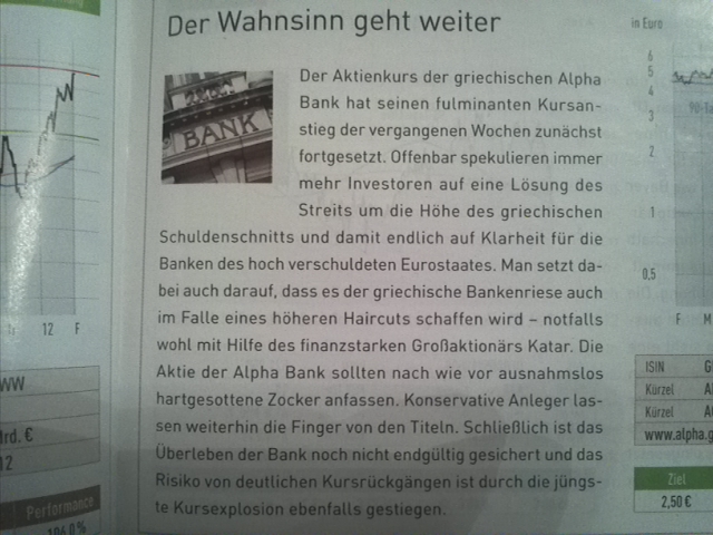 Wer am Ende des vergangenen Jahres vorgeschlagen hätte, nun auf griechische Bankaktien zu setzen, wäre sicherlich ausgelacht worden. Banken und Griechenland ist ja gerade die Kombination der beiden größten Risiken der aktuellen Krise. Dennoch hat sich ein solches Engagement ausgezahlt. Der Aktienkurs der EFG Eurobank legte seit Jahresbeginn um 180 Prozent zu, derjenige der Alpha Bank um 150 Prozent. Anteile an der National Bank of Greece - mit einer Marktkapitalisierung von 2,3 Milliarden Euro ist sie die mit Abstand wertvollste Bank des Landes - sind heute immerhin um 50 Prozent mehr wert als am 1. Januar.