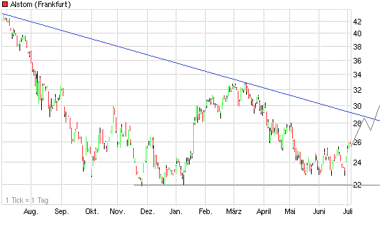 Der Chart zeigt, dass dem Alstom-Kurs noch rund 11 Prozent fehlen, bis er an seinen Abwärtstrend gelangt. Kann er den nach oben durchbrechen, löst die damit verbundene Auflösung der Dreiecksformation ein starkes Kaufsignal aus. Erstes Kursziel danach: 33,- Euro.