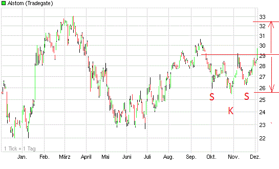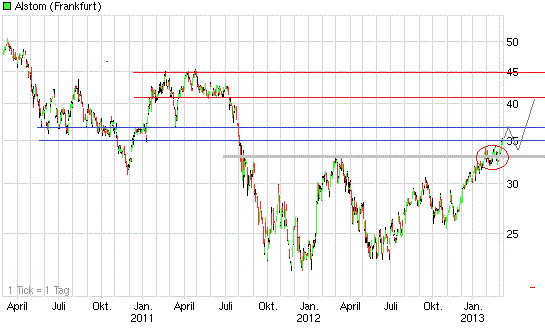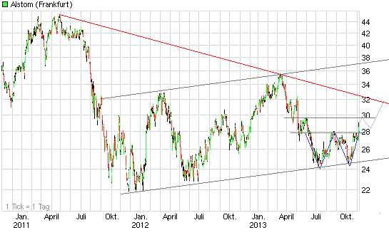 Aus charttechnischer Sicht zeigt die Alstom-Aktie eine Bodenbildung. Schon zum Jahreswechsel 2011/12 hat sich der Aktienkurs mehrfach im Bereich von 22 Euro stabilisiert. Dieser Boden dient als Basis für den breiten Aufwärtstrend, der sich seitdem gebildet hat. Für die nächste Zeit ist mit einer Fortsetzung der breiten Aufwärtsbewegung im Kursband zwischen 25 und 35 Euro zu rechnen.