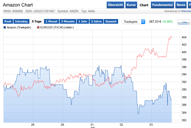 Während in den Staaten der Kurs der Aktie kräftig steigt, fällt er in Deutschland. Ein Blick auf den Aktienkurs - einmal NASDAQ, einmal Tradegate, zeigt warum. Im Vergleich dazu habe ich mal den EUR/USD Kurs eingeblendet (siehe folgende Beiträge).