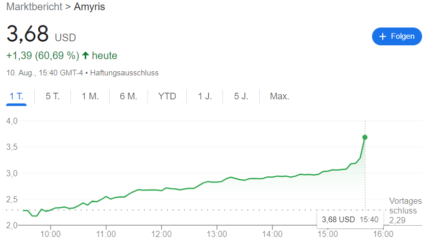 geblieben..... Amyris erstellt zusammen mit David Beckham eine neue Herren-Linie!?Diese Fußball-Legende und der damit verbundene bekannter Name in der Männer (Beauty Welt) ,wird Amyris auch nochmal eine gute Reichweite bescheren ! Und auch heute sieht es bisher sehr gut aus,der Kurs bisher wieder 25 Prozent Plus!!