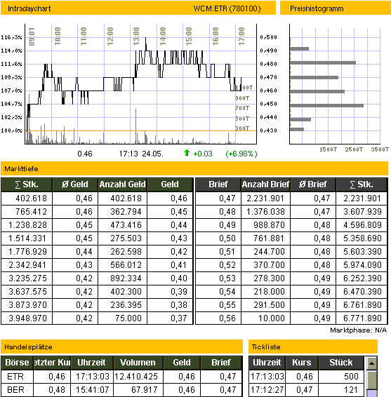Insgesamt waren bis zu diesem Zeitpunkt rund 12 Millionen Aktien gehandelt worden. Der MDAX selbst fiel zugleich um 0,09 Prozent auf 5.856,762Punkte. WCM war nach der Telekom (20 Mio Aktien gehandelt) die am meisten gehandelte Aktie im 110 Werte umfassenden HDAX.