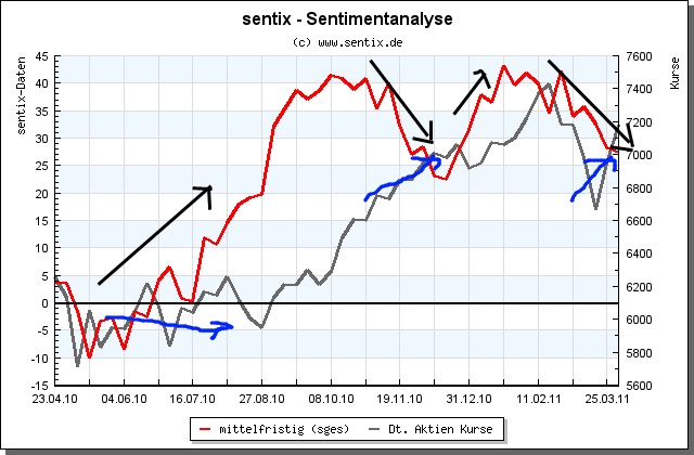 Beispiel: Vorletzte Woche = Selbst am Freitag (vor dem langen Wochenende - Japan hatte am Montag letzter Woche geschlossen) bemerkenswert stabile Kurse bei katastrophalen Nachrichten aus Japan. Jeder krakeelte nach fallenden Kursen, aber die Börse wollte einfach nicht runter, nicht mal vor dem langen - mit Unsicherheiten aus Japan belasteten - Wochenende.