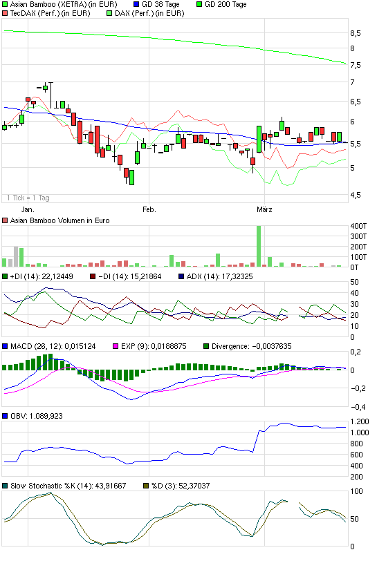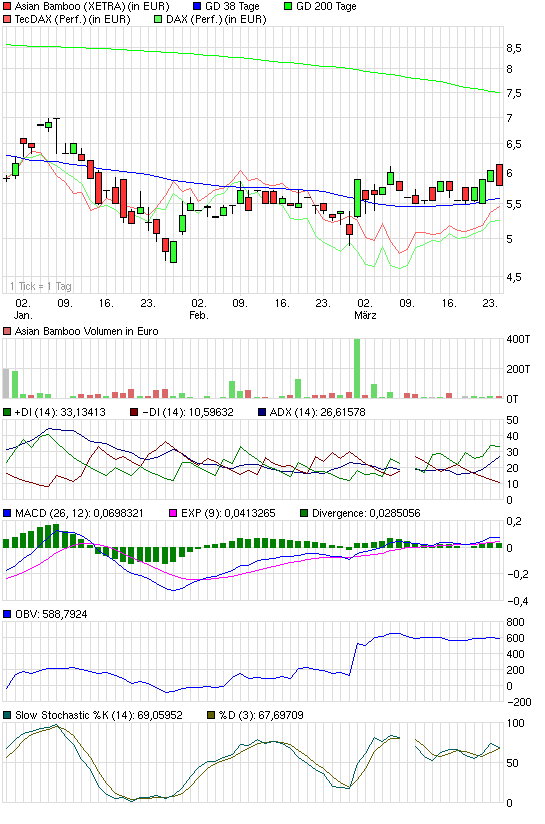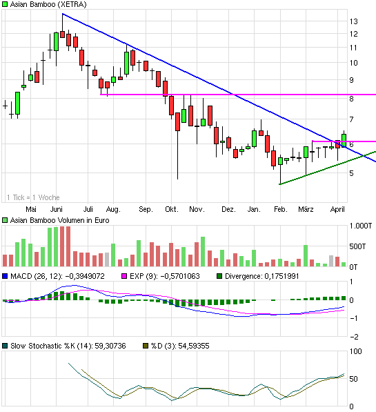 Dazu müsste der Kurs über die 6,1 €. Lange dürfte es aber eh nicht mehr dauern. Die Zeit läuft fundamental und charttechnisch für Asian Bamboo.