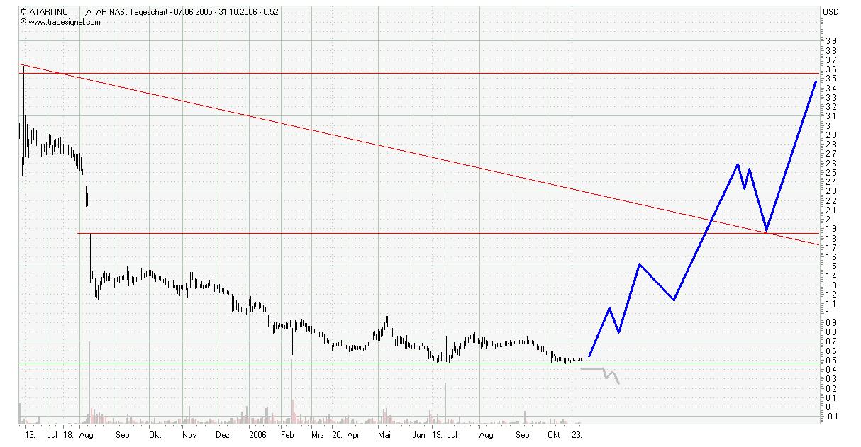 Charttechnisch sieht es nach einer Bodenbildung aus sollte der Bereich um die 0,5 $ halten seh ich Dollars winken *G* bricht atari durch sind meine jowood Gewinne eben wieder weg *G* no risk no fun