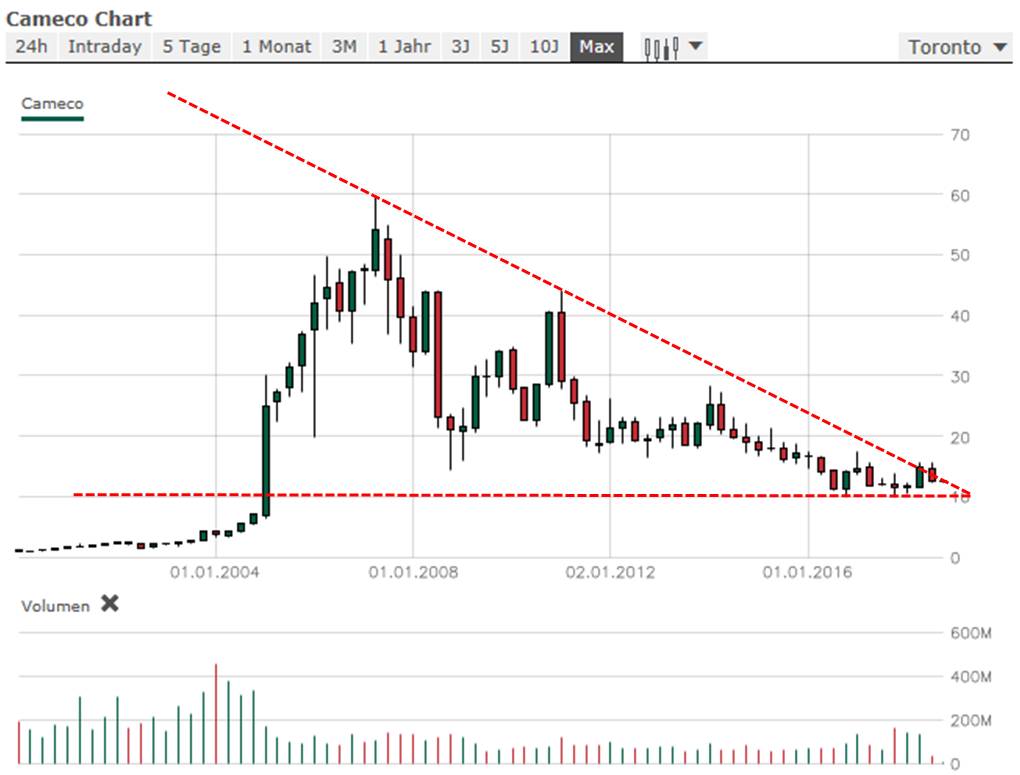 @Dölauer Kurzfristi­g glaube ich nicht! Warum? Weil Cameco langjährig­e Abnahmever­träge mit höheren Preisen als der Spot-Markt­ die letzten Jahre hergegeben­ hat, abgeschlos­sen hatte. 60% laufen hier über diese Verträge. Nur 40% über Spot-´Mark­t. Jetzt laufen die Verträge langsam aus und Cameco bekommt ein Problem, da sie die Verträge erneuern müssen und zwar zu niederiger­en Preisen. Es sei denn Cameco entscheide­t sich für 100% Spot-Markt­. Kann ich mir nicht vorstellen­, da der Ladenextre­m konservati­v agiert. Langzeit-C­hart liest sich spannend aber ich rechne hier weiterhin mit fallenden Kursen bis 10 CAN. Nächste Haltelinie­n aktuell bei 12,38 und 11,54