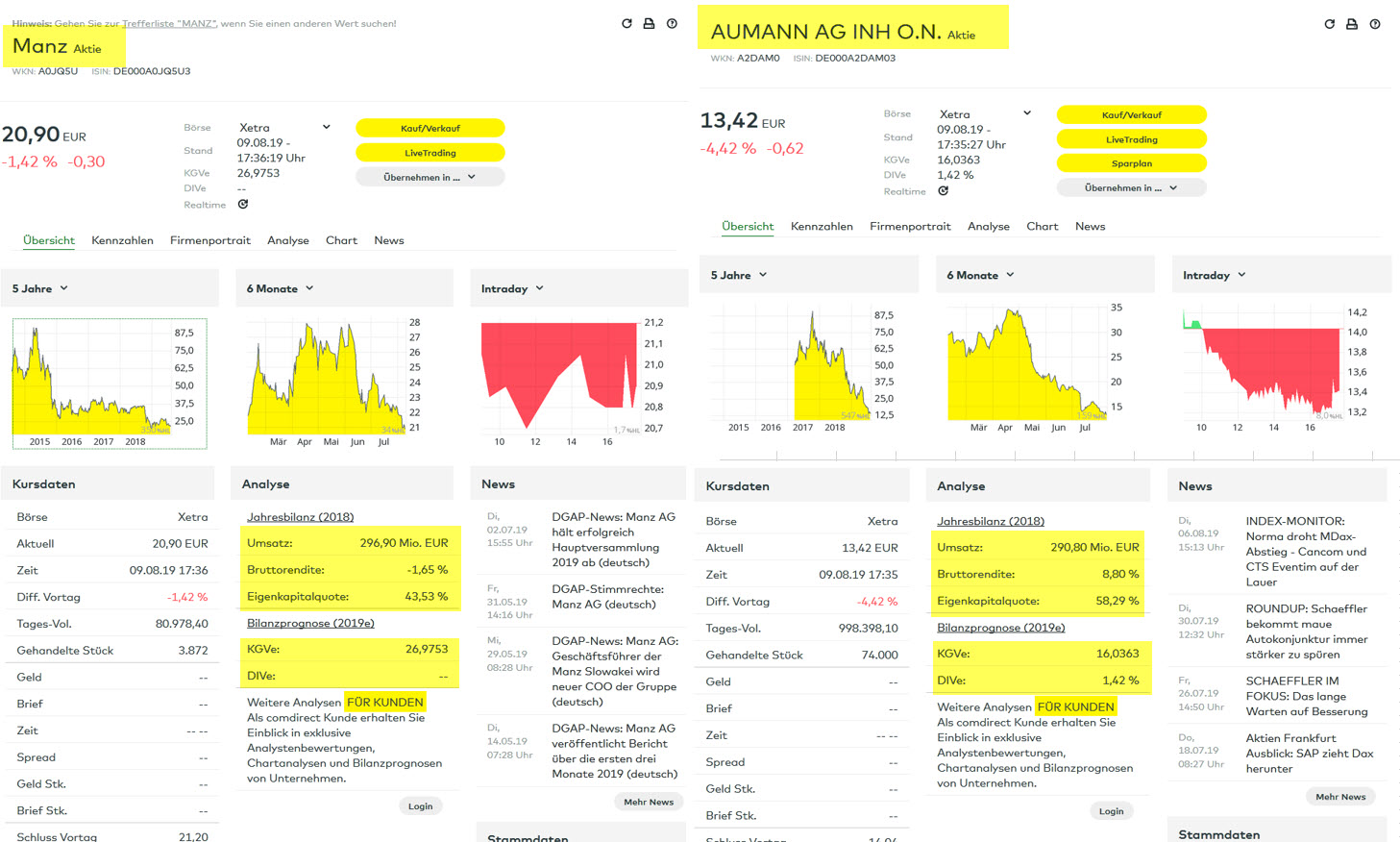 Beide sind Maschinenbauer und ungefähr gleich groß. Der eine baut Anlagen für Batterien und Photovoltaikpanels der andere baut Anlagen für E-Motoren und Automatisierung. Manz hat in allen Kennzahlen die schlechteren Werte, wird aber an der Börse wesentlich höher gehandelt. (s. Anlagen)