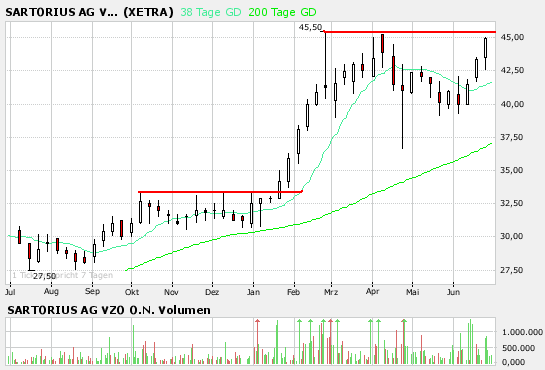 Aktuell sind wir wieder an den Widerstand um 45€ herangelaufen.
