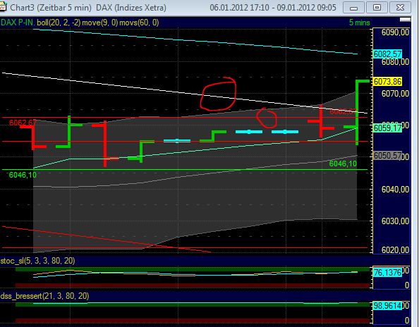 leider mit bb kein Glück gehabt, die vierte xetra Kerze heute morgen gehandelt (-9 dazu -2 spread CFD), einen "normalen Gimme Einstieg 9:55 6133 10:08 SL 6142 (war hoch) gerissen wobei der Trade quatsch war da viel zu nah an EMA 9 und einmal Euro um 11:55 (pm0), macht minus 22 mal 2 CFD (immer noch zum üben...) =-44€. Daneben hatte ich bei 6120 gestern 50 short ko (DB gebührenfrei) gekauft und heute bei 6030 vor die Tür gesetzt - damit mal wieder ein nuller :-) es häl sich stabil aber ich ahne den Ausbruch nach oben....