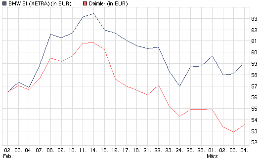 Daimler ist vorsichtig optimistisch, schätzt die Lage der Automobilbranche ähnlich ein. Vorteil für Daimler allerdings ist, dass der EADS-Verkauf wohl voran kommt und Geld in die Kasse spülen wird, zudem die Lage bei den Nutzfahrzeugen günstiger aussieht als bei den PKWs. LKWs und Busse werden 2011 u.U. besser verkauft als PKWs. Bei den Nutzfahrzeugen ist Daimler weltweiter Marktführer und investiert, wie berichtet wird, in Indien (Einführung eines neuen LkW). Die Abhängigkeit vom chinesischen Markt wird so gemindert. Zudem hat Daimler vor, mit Krauss-Maffei zu kooperieren. Insgesamt scheint Daimler damit wohl doch besser aufgestellt zu sein als BMW mit Mini, Motorrädern und Rolls-Royce. Das Kurspotential bei BMW scheint für 2011 begrenzt, während das von Daimler wohl noch nicht voll ausgeschöpft ist. Die Kurse beider Aktien könnten sich somit eher noch angleichen als auseinander zu streben.