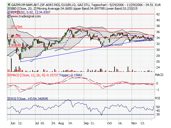 Das Papier ist nach einem Downer in den seit Juni bestehenden Aufwärtstrend (blau) zurückgekehrt. Gleichzeitig erfolgt eine Annäherung an die Obergrenze des Abwärtstrends (rot, seit August). Diese Marke wurde heute im Tagesverlauf bereits angetestet. Allerdings sind die Umsätze nicht so berauschend.