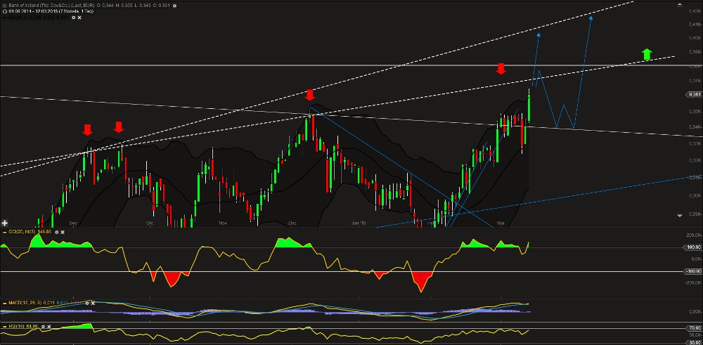 und heute, am 14. März, legte die Bank of Irland mehr als 6% zu. Die charttechnische Widerstandslinie wurde mühelos genommen und das Kaufsignal zeigte Wirkung. Die Aktien stehen auf einem Jahreshoch! Der Weg bis über 0,40 Euro ist nun frei und wir sind sicher, dass wir das Kursziel früher erreichen, als gedacht.