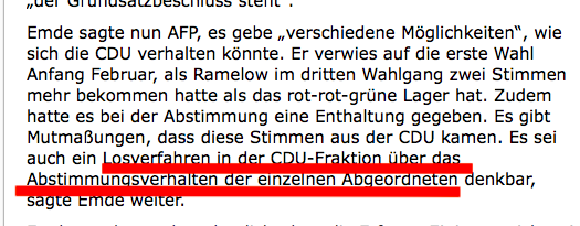 Um diesem die absolute Mehrheit im Parlament zu sichern, musste die CDU zusagen, dass mehrere ihrer Abgeordneten für Ramelow votieren werden. Sie hat überdies zugesagt, dass von diesem Tag an eine faktische Tolerierung einer rot-rot-grünen Regierung durch die Union erfolgen wird (auch wenn man das nicht so nennt).