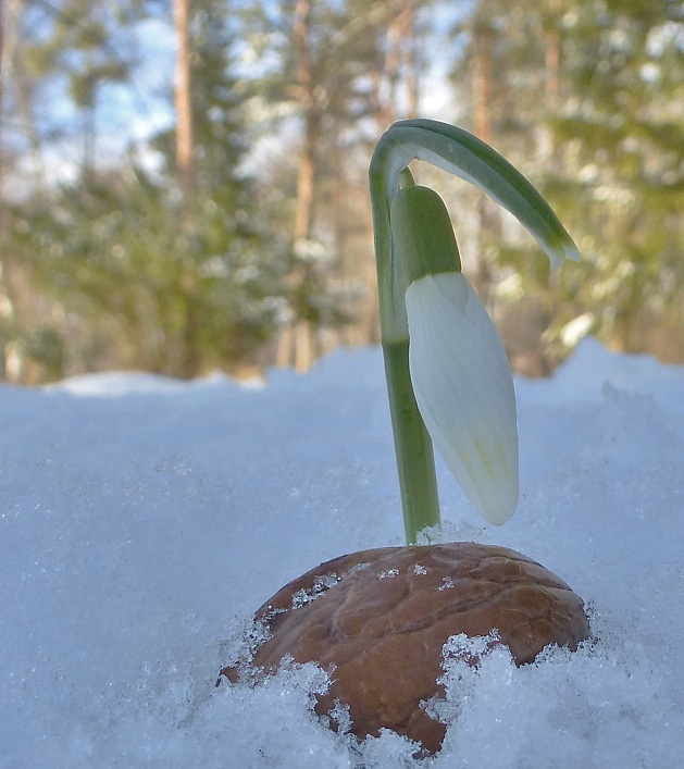 Schneeglöckchen mit Walnuss-Schale. Ich habe keinen Plan,
