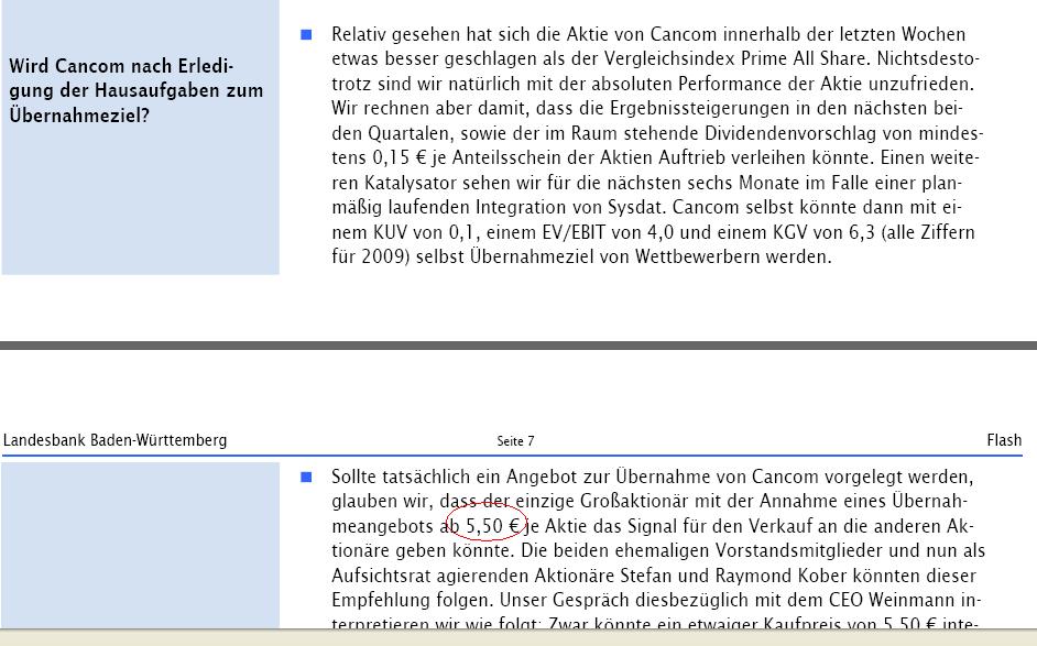 Cancom ist jetzt schon bei 4,0-4,2 € schon genauso teuer (nach KGV, KCV und KBV) wie Computerlinks bei 15,5 € also dem Übernahmepreis. Mehr als 5,5 € wäre dann schon ne fette Prämie.