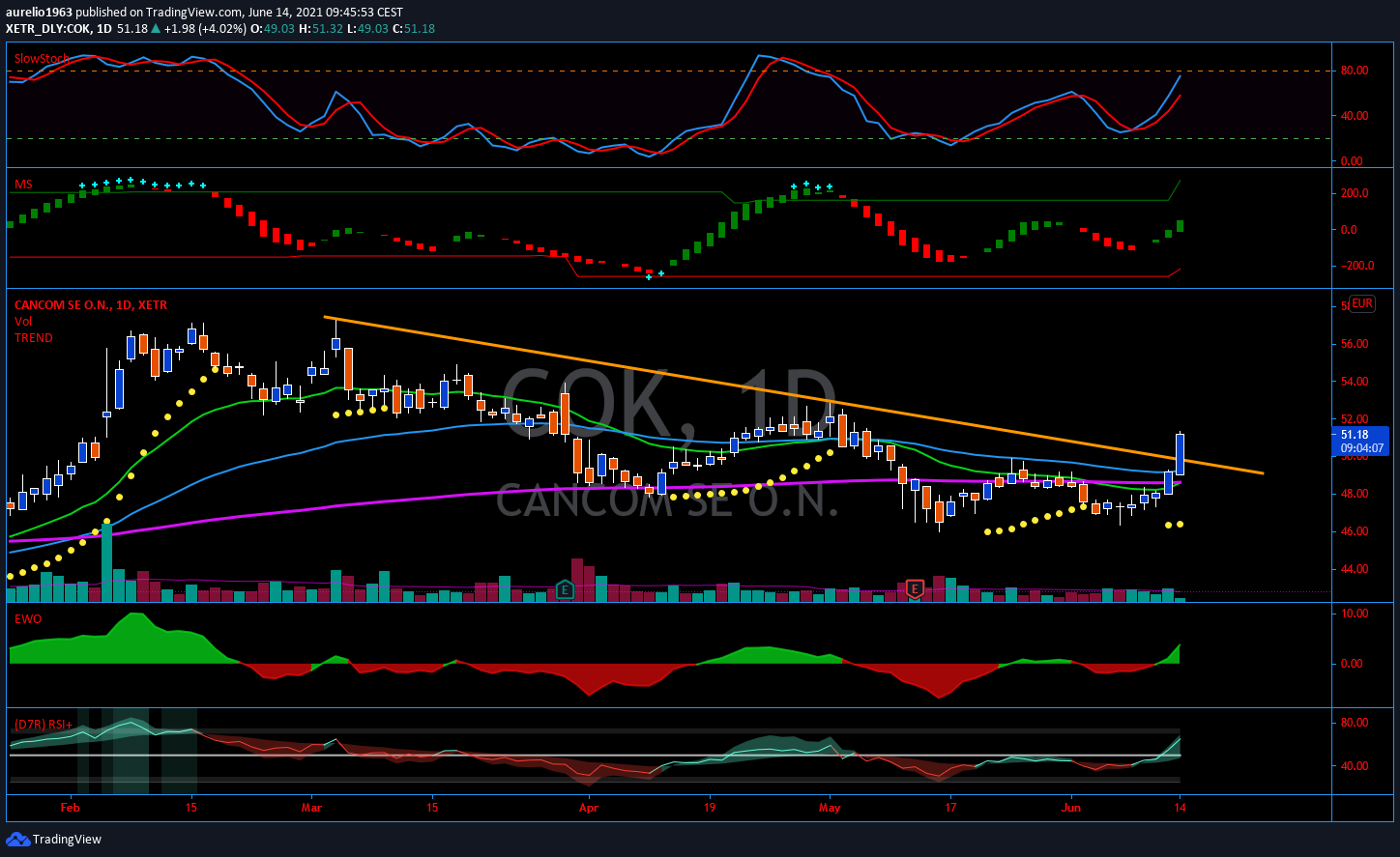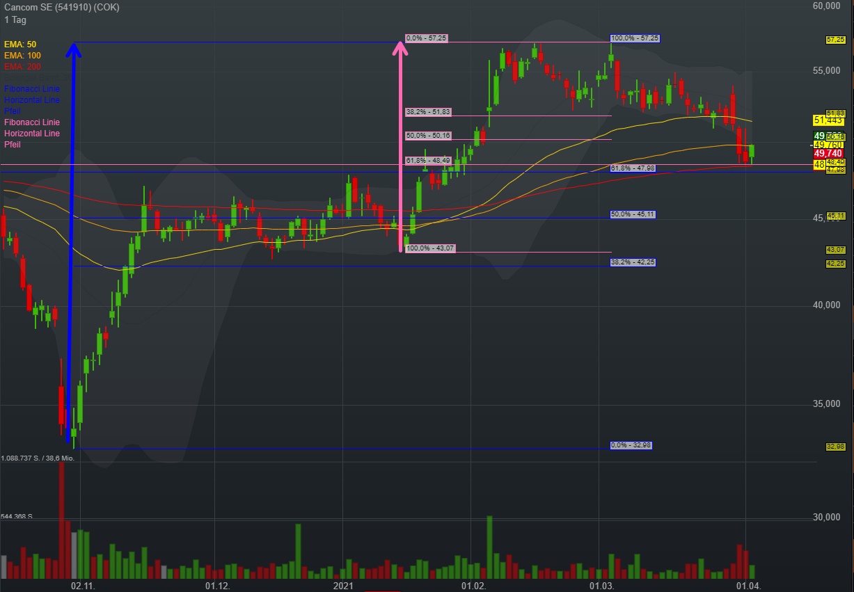 Cancom ist aus charttechnischer Sicht super interessant geworden. Der letzte Rückläufer geht an die EMA 200 und an die pinke sowie die blaue Fibonacci Retracements. Dazu kommt eine grüne Tageskerze mit Rücklauf in das Bollinger Band. Einstieg bei 49,50 long ! Einfach mal den Chart anschauen und selber entscheiden. :)
