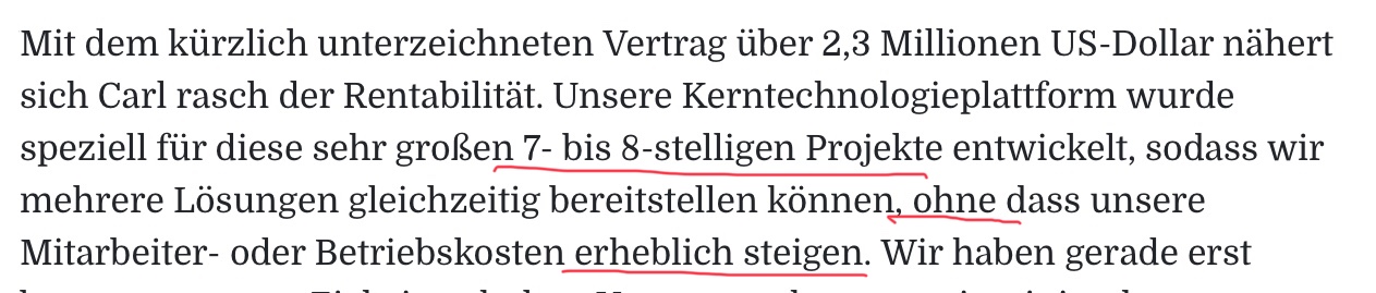 dahingehend, dass die Produkte von CARL leicht skalierbar sind und, wie der CEO sagt, mit nur wenig Mehraufwand beliebig ausgerollt werden können. Typisches Lizenz-Geschäft eben. Wenn nun Verträge von 10-20 Mio abgeschlossen werden können (CARL geht nächstes Jahr wohl von ca. 10 Mio aus, ist aber eher konservativ) und die Kosten bei vielleicht 3 Mio. bleiben, dann haben wir natürlich plötzlich ein Unternehmen, welches bei einem KGV von 10-15 plötzlich 100 Mio oder mehr wert sein könnte.....Wenn der Kurs sich dann binnen 12 Monaten verfünf-facht ist das wohl auch irgendwo ein "Knall".