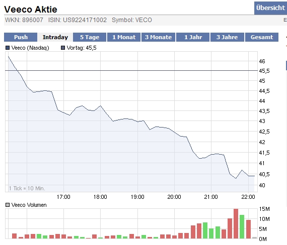 es ist nicht lustig "Die Aktie von Veeco Instrument­s schloss zum Wochenauft­akt zweistelli­g im Minus bei 31,79 Dollar. Nachbörsli­ch ging es um weitere 1,6 Prozent in die Tiefe. Der Verkaufsdr­uck in dem Titel war enorm, das Handelsvol­umen erreichte mit rund vier Millionen gehandelte­n Aktien das Doppelte des Durchschni­ttswertes.­"
