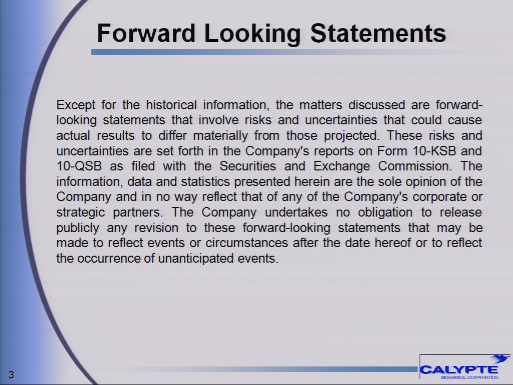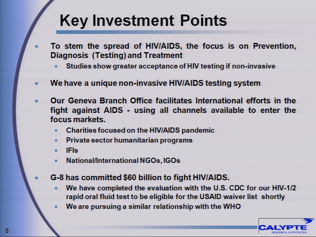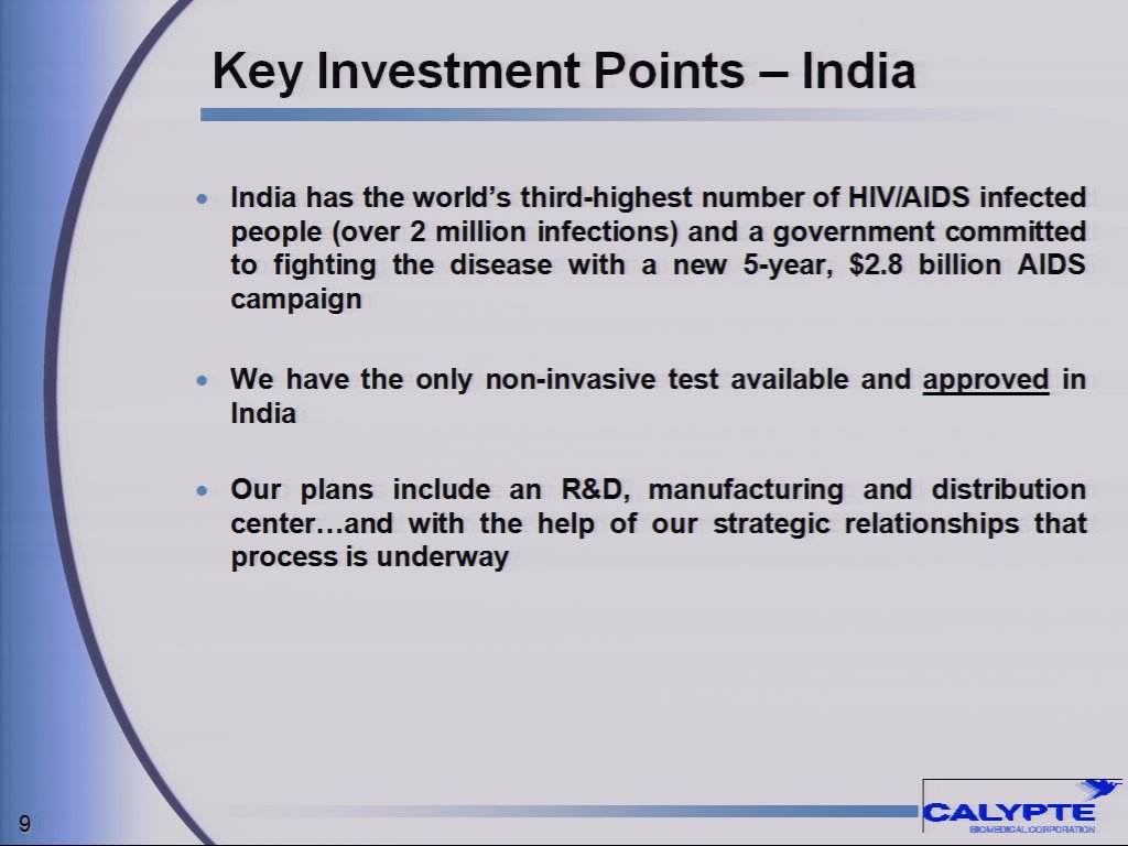 Roger Gale, Calypte's Chairman and Chief Executive Officer, stated, "As has been highlighted in recent news reports, India is at the forefront in the fight against HIV/AIDS and we have seen strong interest in our oral fluid tests from both the Government and private sectors. A Calypte team has just returned from India where we have begun putting in place the infrastructure to access and build on this important business opportunity. We expect the market for HIV diagnostic testing in India to grow significantly in the next few years."