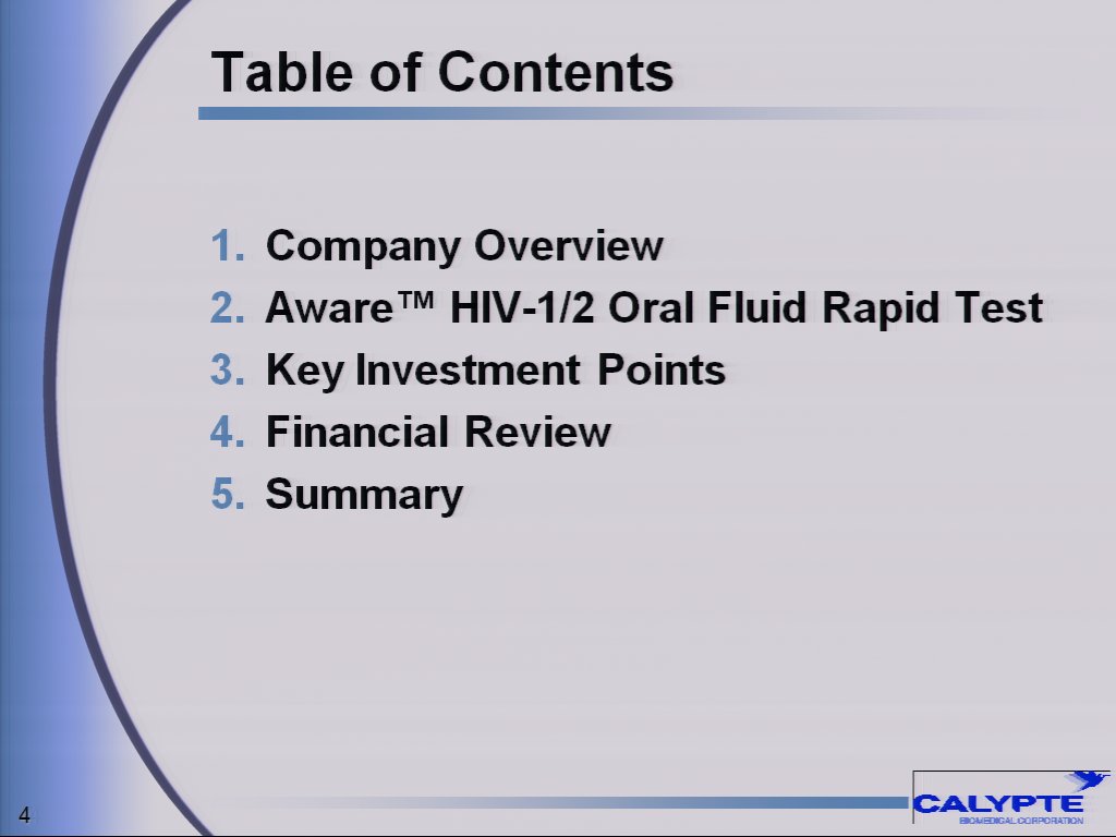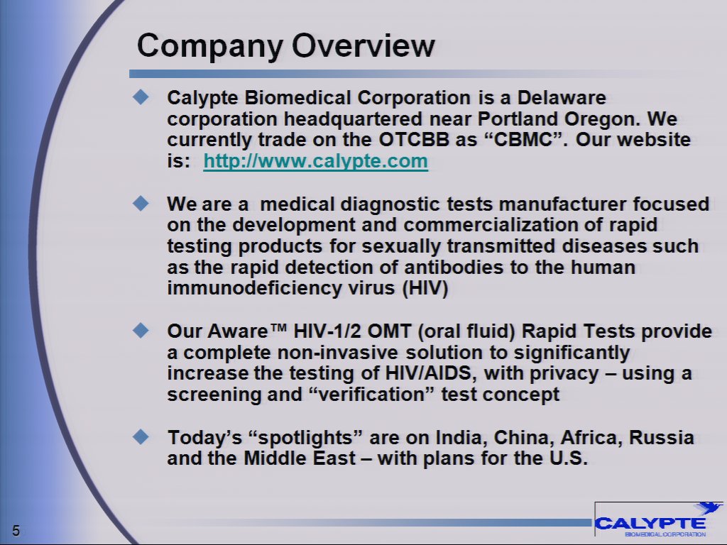 Calypte Biomedical Corporation (www.calypte.com) is a U.S.-based healthcare company focused on the development and commercialization of rapid testing products for sexually transmitted diseases such as the Aware(TM) HIV-1/2 OMT test that are suitable for use at the point of care and at home. Calypte believes there is a significant need for rapid detection of such diseases globally to control their proliferation, particularly in developing countries, which lack the medical infrastructure to support laboratory-based testing. Calypte believes that testing for HIV and other sexually transmitted infectious diseases may make important contributions to public health, and could increase the likelihood of treating those with undetected HIV and other sexually transmitted diseases.