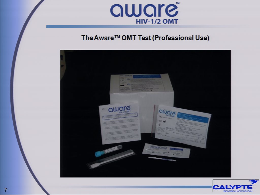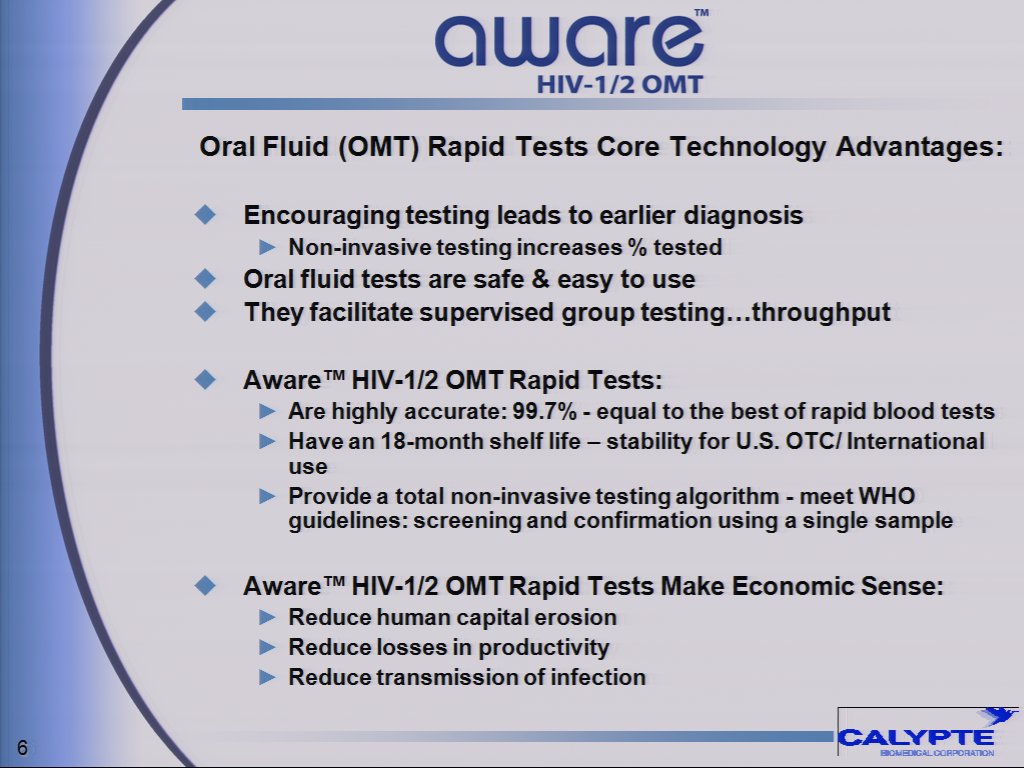 Mr. Gale continued, "This DCAI approval is a significant milestone in the advancement of our business; a very exciting time for all of us at the Company. Once our non-invasive HIV diagnostic tests gain market acceptance, we anticipate significant growth in market share of such tests. In addition to creating a distribution network, we expect to establish both research and manufacturing operations in India. While we will initially enter the Indian market with our HIV-1/2 oral fluid rapid test, we are also considering introducing our Aware(TM) HIV-1/2 rapid tests using both blood and urine samples to complement the current oral fluid test. India is also a logical center for development of Calypte's new products."