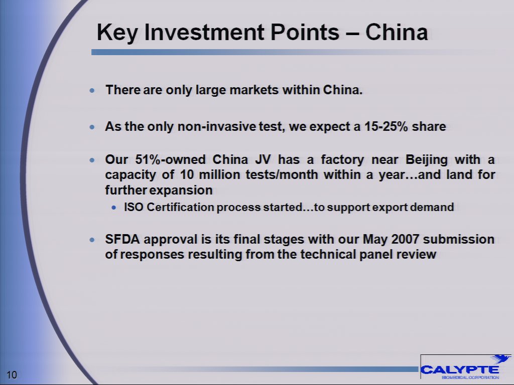 "I personally took a company that was headquartered in Houston to Dubai, set up a regional center and then used the in-country advantage to capture a 50% market share. I believe Calypte's simple, accurate, non-invasive products will be well received in this part of the world. I have personally accompanied management and visited key business contacts in UAE and have seen for myself the strong interest Calypte's products generate," Mr. Karas continued.
