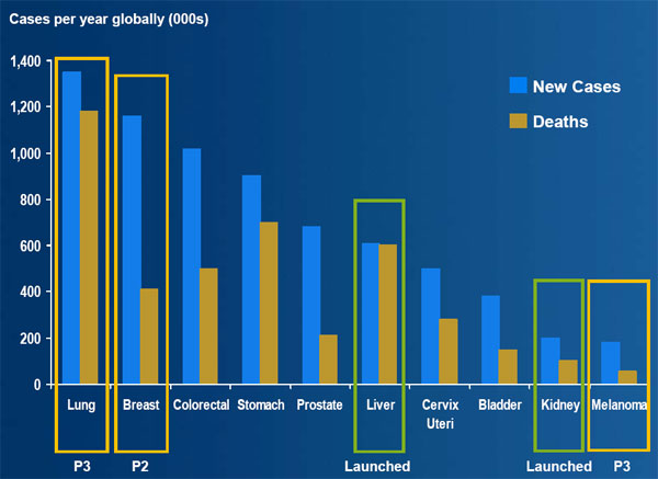 | BAY-43-9006 (updated) | Onyx Pharmaceuticals (nasdaq: ONXX - news - people ), Bayer (nyse: BAY - news - people ) | Advanced kidney cancer | Awaiting regulatory submission |