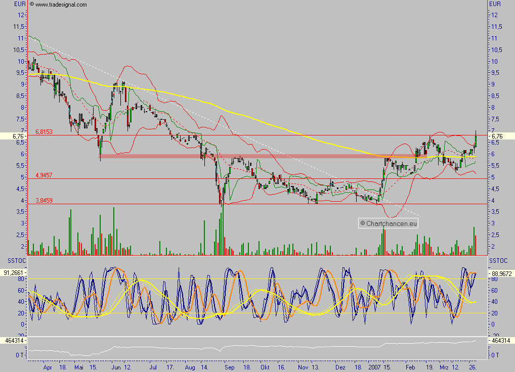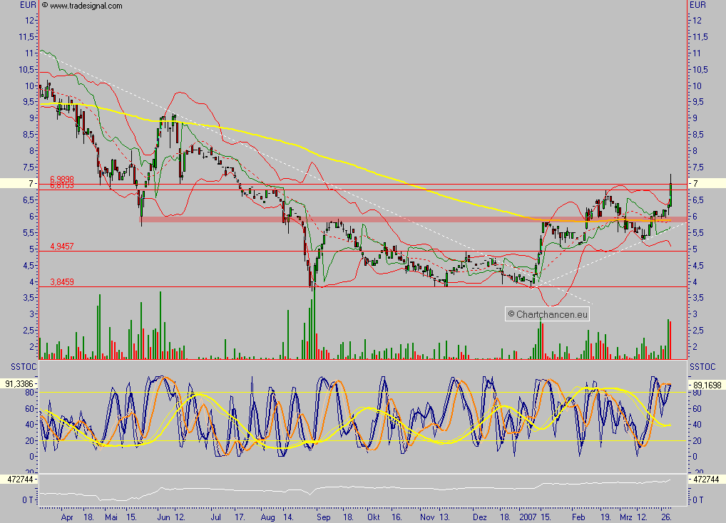Bei so geringen Umsätzen wäre ich mit einer Chartanalyse mal vorsichtig. Aussgefähig sind diese eher in Märkten mit hohen Umsätzen. Grundsätzlich würde ich aber sagen, dass wenn die Aktie mit hohen Umsätzen sprunghaft steigt, kam bisher immer eine gute Meldung des Unternehmens. Ist halt Entry Standard, dort muss man mit solchen Dingen rechnen.