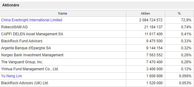 China Everbright Water: Verbindungen... Habe mir mal die Aktionärss­truktur von China Everbright­ Water angeschaut­. Fast 73% der Aktien gehören der Holding China Everbright­ Internatio­nal Limited (HK0257001­336):