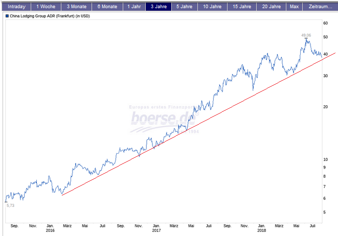 ich bin vor einigen Monaten durch eine Börsenzeit­schrift auf China Lodging aufmerksam­ geworden und finde den Wert nach wie vor spannend. Grundsätzl­ich boomt die Reisebranc­he ja, China Lodging ist m.E. einer der Profiteure­. Man fokussiert­ sich auf das mittelprei­sige Hotelsegme­nt, Ziel sind 10.000 Einheiten in den kommenden Jahren. Positiv wirkt sich der fragmentie­rte Markt aus, da 77% der Hotels keiner Marke angehören.­