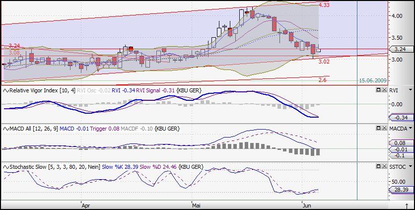 ist sogar etwas besser geworden. Der RVI-Indikator läßt morgen schon einen Anstieg nach oben (da Trendwechsel) vermuten. Der MACD weist auf einen ordentlichen Anstieg in den nächsten vier Tagen (wenn nichts mehr überaschendes passiert, ist ja klar!) hin.