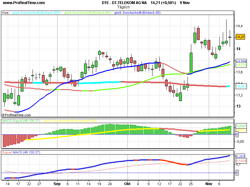 Lasst Euch nicht ins Bockshorn jagen. Es sieht so aus, als hätte sich unter den Analystenbankern 2 Fronten gebildet. Die Anti-wir-wollen-Telekom-nicht-steigen-sehen Gruppierung und die Jetzt-oder-nie-Telekom-muss-steigen Gruppe. Anders lassen sich die laufend innerhalb eines Tages Down- und Uprating Einschätzungen nicht lesen. Ich weise nochmals auf den Branchenvergleich hin. Dieser trennt die Telekom vom Branchenschnitt um ca. 5 Euro. Um diese 5 Euro wird nun gekämpft ! Zwangsläufig lässt sich das aber nicht aufhalten. So wird der Kurs also bis Februar bei ca. 20 Euro landen.