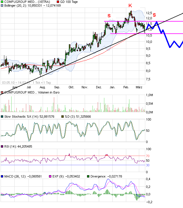 besteht zudem die Gefahr einen SKS, falls man die 11,7 € nicht in den nächsten Wochen bis etwa Ende April überbietet. In dem Fall einer SKS wäre auch ein Rückgang bis 9,6 oder gar 9,2 € nicht auszuschließen. Ist aber bislang Spekulation. Noch ist der Uptrend nicht signifikant gebrochen und selbst wenn es noch lange kein Downtrend gegeben. Es würde immernoch für eine längere Seitwärtskonsolidierung sprechen.