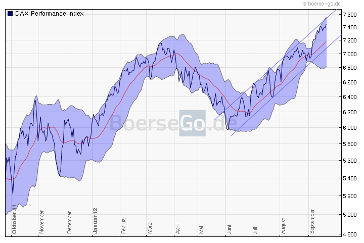 Schauen wir mal den Kurzfristchart beim Daxe an: Aufwärtstrend intakt, könnte in den nächsten Tagen die mittlere Böllinger-Linie bei 7200 kurzfrist unterschreiten, dann aber ab Richtung 7600 und höher, bevor es zu einer Korrektur um mindestens 1200 Punkten kommt...