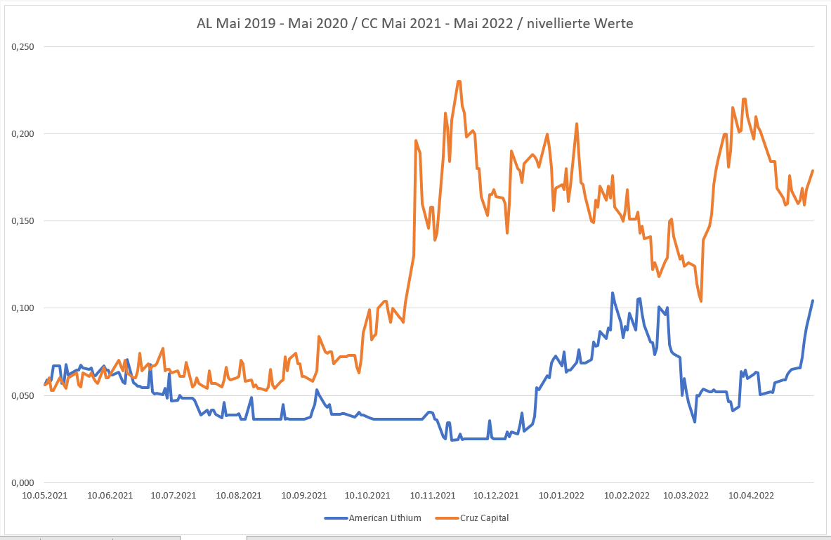 Vor 2 Jahren war American Lithium ca. bei € 0,14, Cruz ist jetzt auch bei ca. € 0,14 und würde mit seinem Einjahreschart über American Lithium von Mai 2019 bis Mai 2020 liegen (ohne Prozent, da beide Kurse in etwa gleich sind - der aktuelle Cruz-Kurs und der American Lithium-Kurs von vor 2 Jahren).
